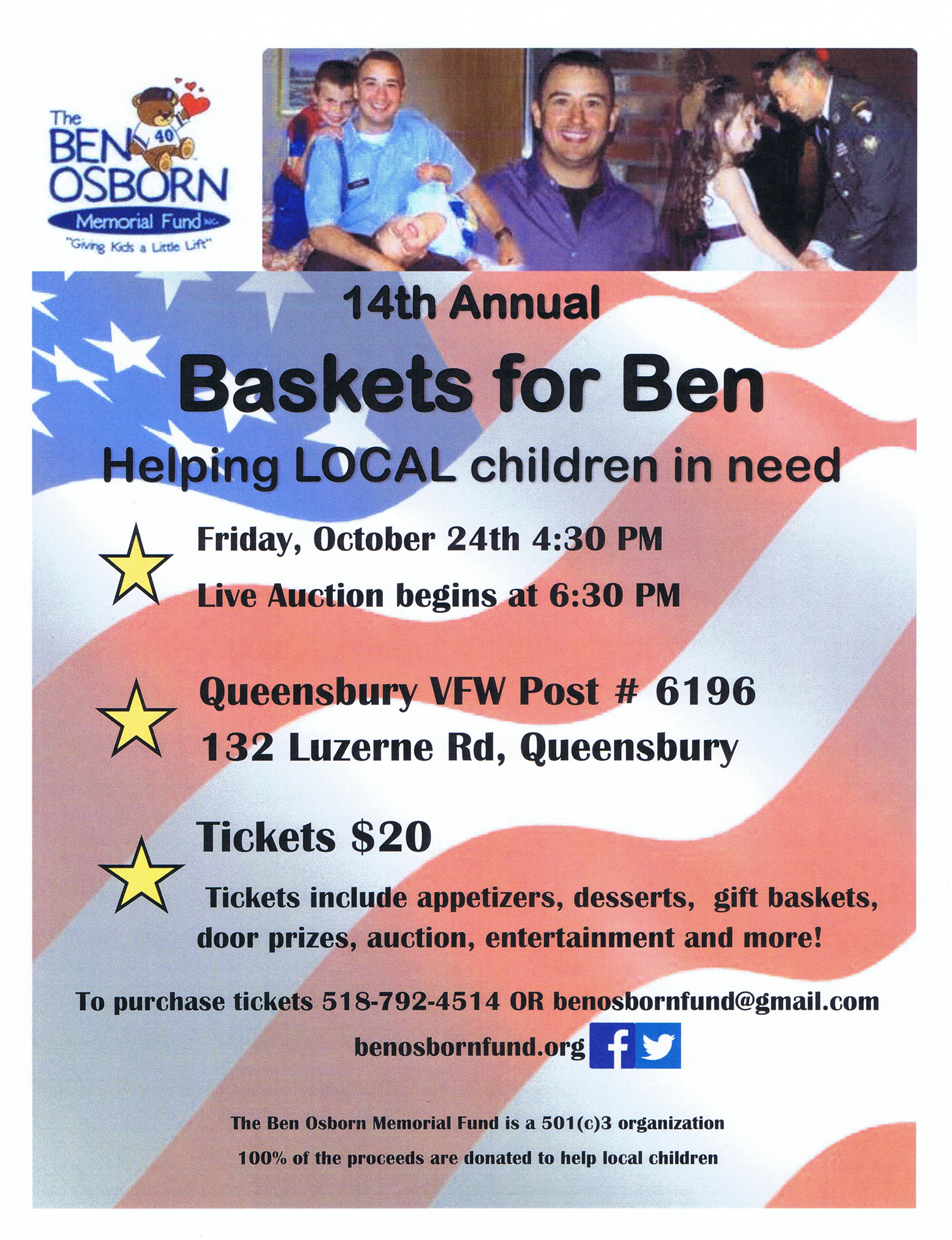 This Friday, October 24th at 4:30pm the annual Ben Osborn Memorial Fund "Baskets for Ben" fundraiser will take place at the VFW Post #6196 in Queensbury. Tickets are only $20 and include a buffet dinner, a chance at door prizes, entertainment, a live auction at 6:30pm and more!